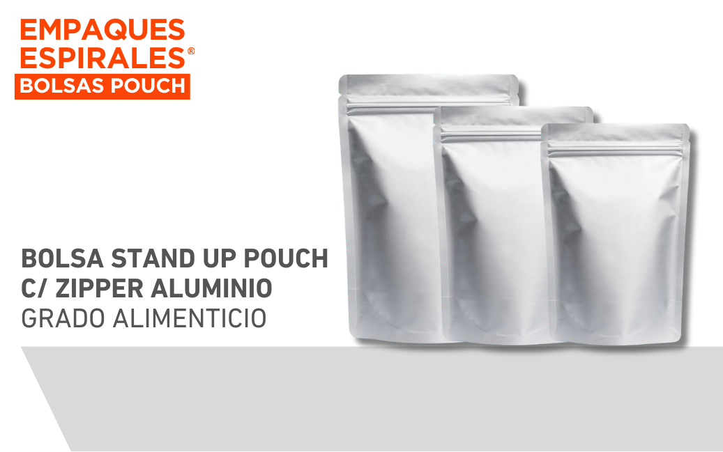 Bolsa tipo stand up pouch fabricada en aluminio grado alimenticio, con cierre hermético tipo zipper que permite abrir y volver a sellar el empaque múltiples veces sin perder frescura. Su acabado metálico ofrece una excelente barrera contra humedad, luz y contaminantes externos, prolongando la vida útil del producto envasado. El diseño con fuelle inferior asegura estabilidad para exhibición en anaquel.